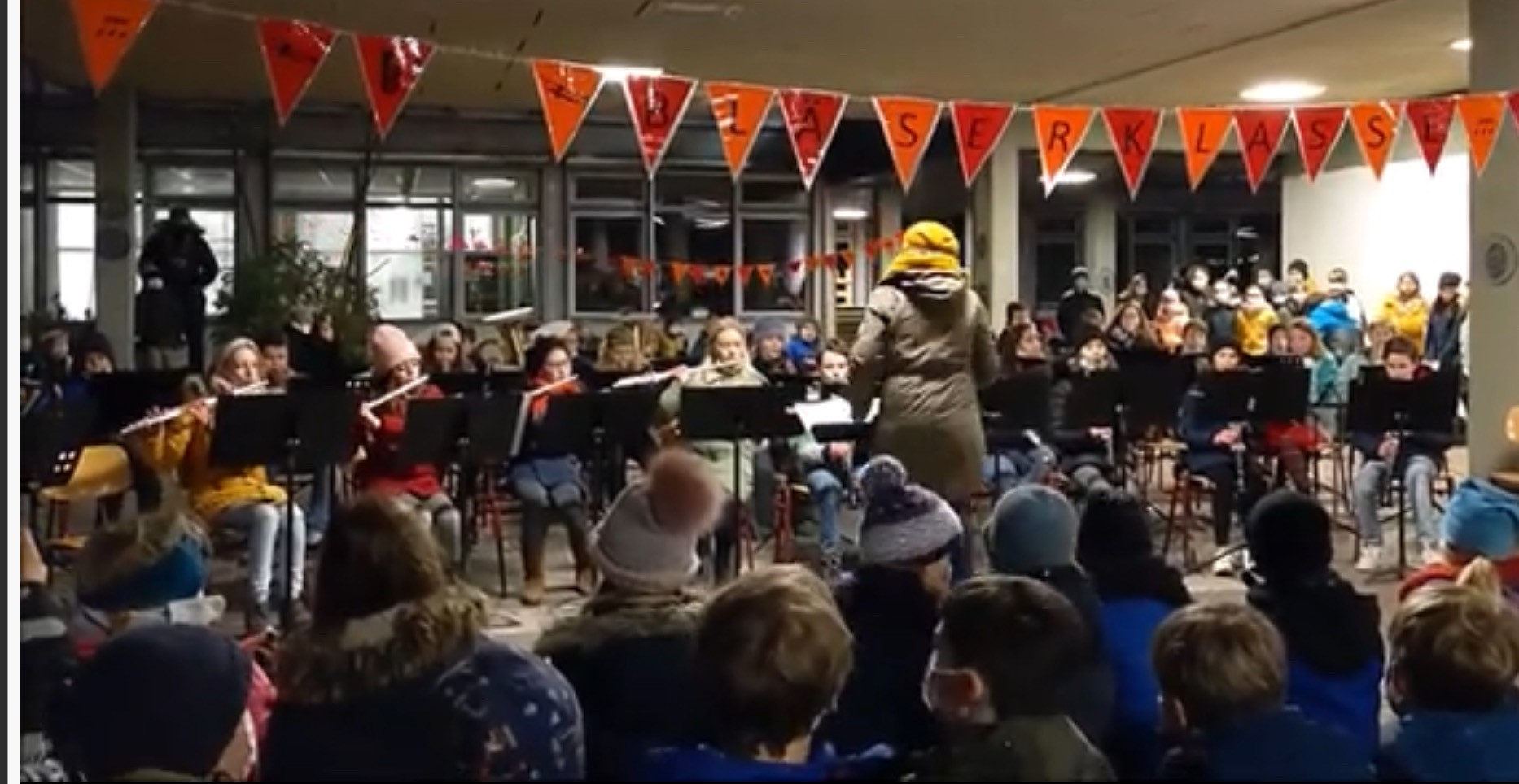 Die aufgebauten Infowände und Schüler:innen gaben dann noch Auskunft und es wurden viele Fragen gestellt. Wir freuen uns darüber, dass bestimmt ganz viele Kinder im nächsten Schuljahr auch in die Bläserklasse gehen werden. Durchgefroren aber glücklich und stolz sind wir dann nach Hause gegangen.