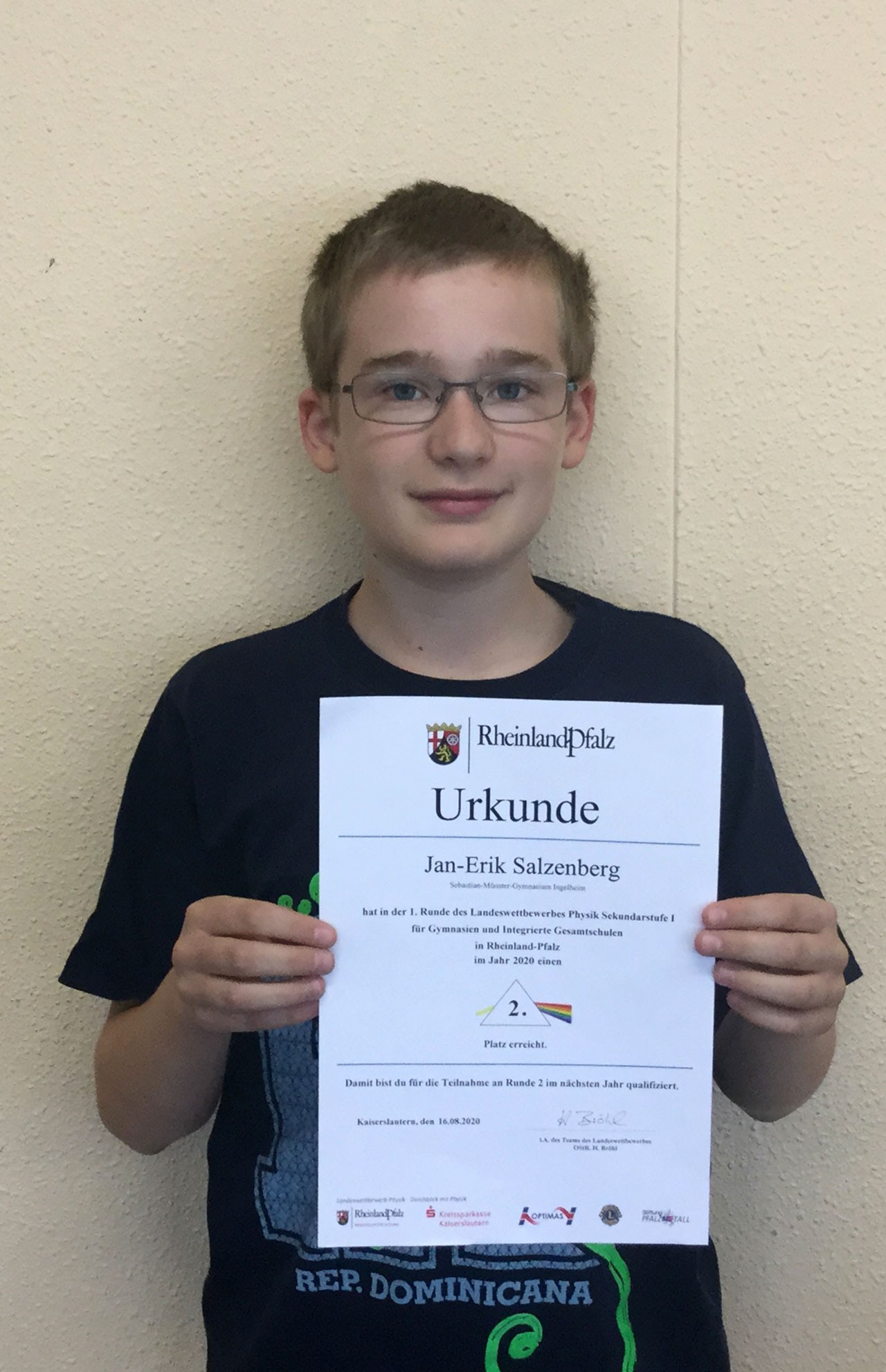 Jan-Erik Salzenberg war dabei so erfolgreich, dass er einen zweiten Platz belegen konnte und sich somit für die 2. Runde im neuen Schuljahr qualifiziert hat. Die Physikfachschaft gratuliert dem Nachwuchsphysiker herzlich!