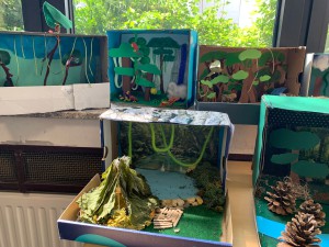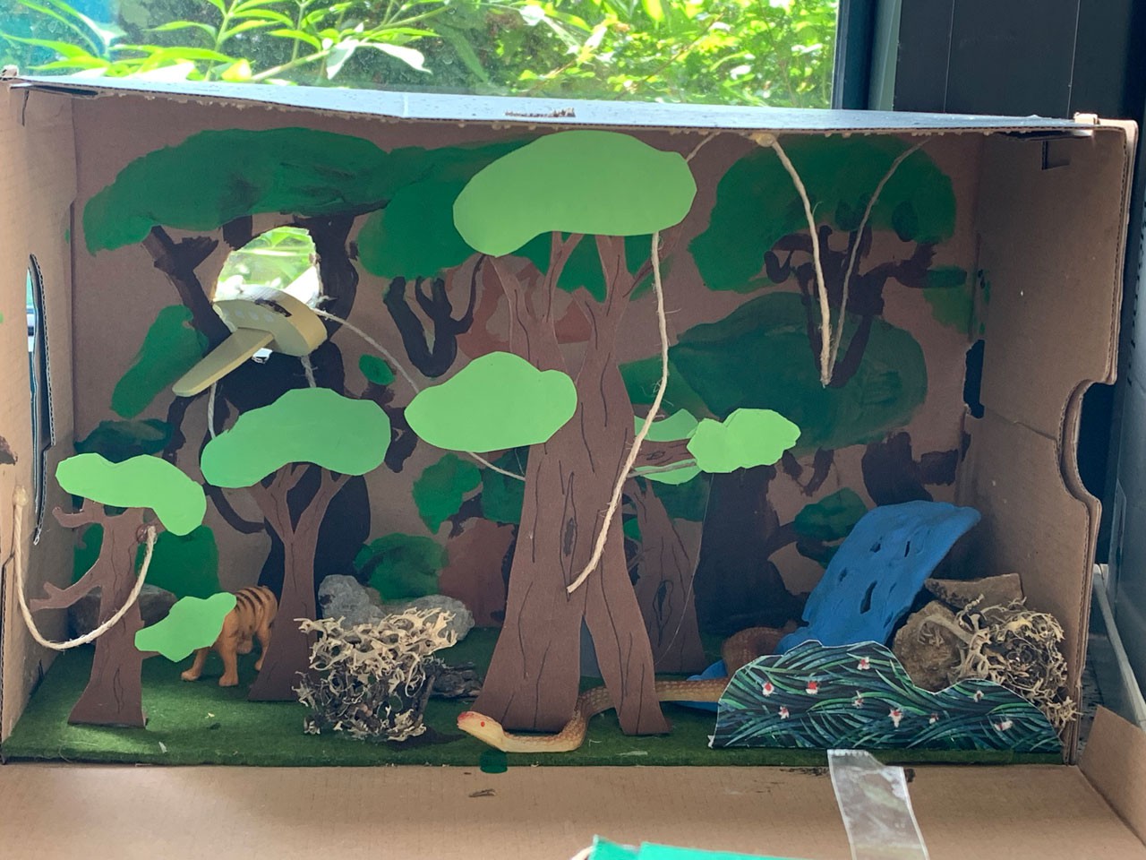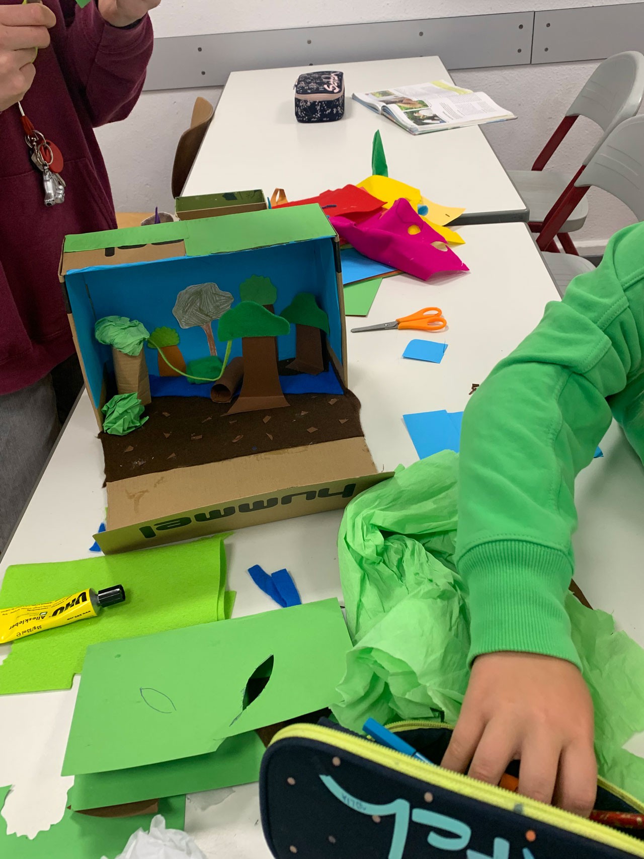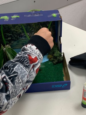 Die Klasse 5b hat im Erdkunde-Unterricht das Thema Regenwald durchgenommen. Nach einer umfangreichen Stationenarbeit zu diesem Thema hat die Klasse mit Modellen den Regenwald „nach Ingelheim geholt". Dazu haben sie in Schuhkartons möglichst detaillierte Nachbildungen von Regenwäldern mit Bastelmaterial nachgestellt.