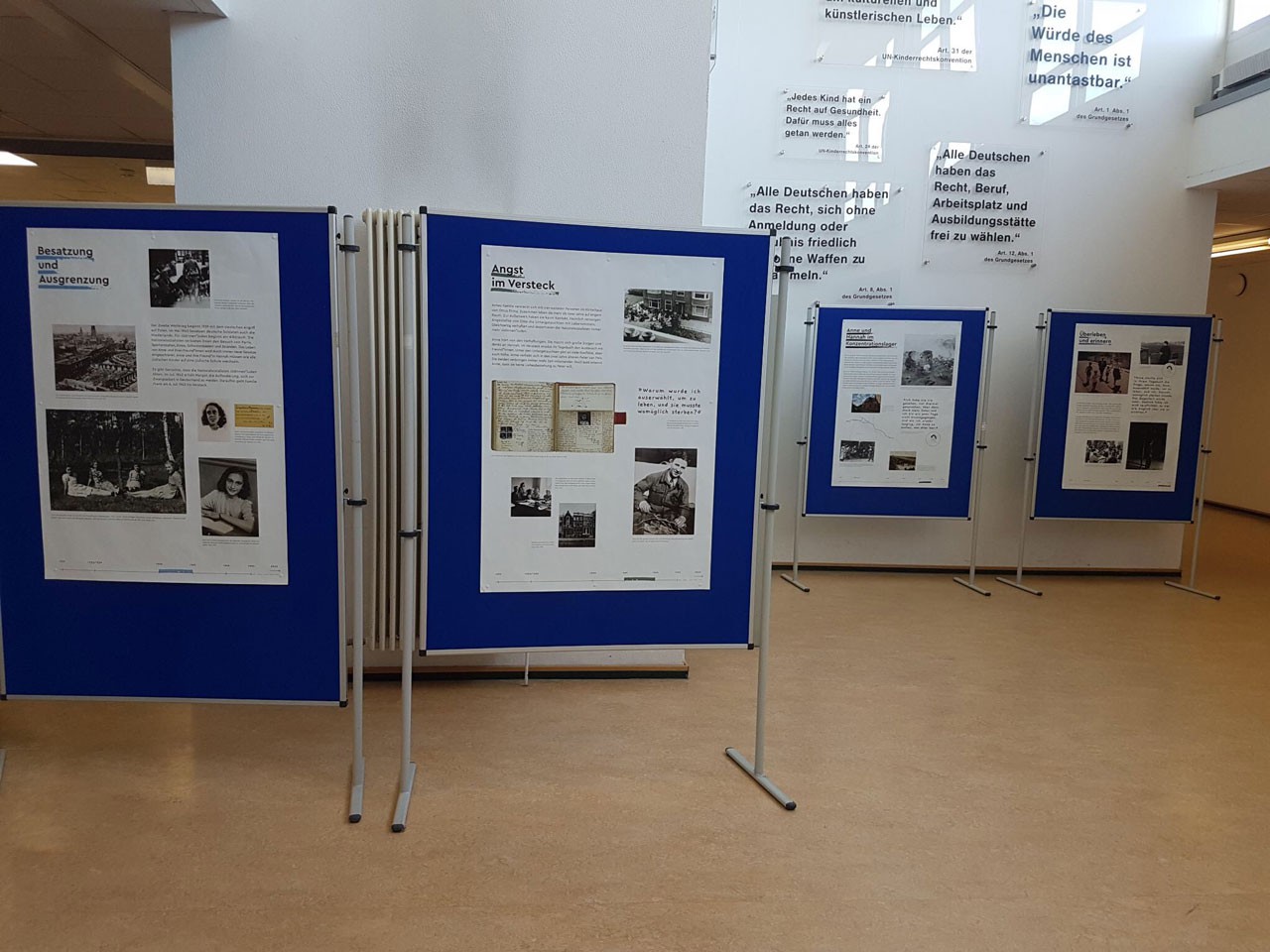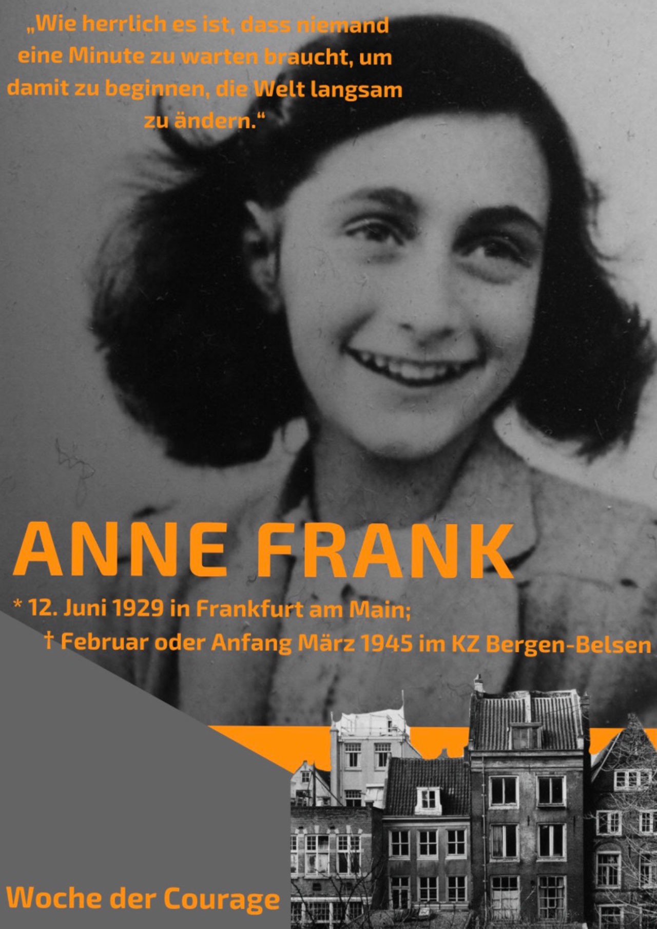 In diesem Jahr hat die AG „Schule ohne Rassismus – Schule mit Courage“ anlässlich des Anne-Frank-Tags (12. Juni) eine „Woche der Courage“ vom 13.-15. Juni an der gesamten Schule ausgerufen. Es waren alle eingeladen, sich zu beteiligen – ob innerhalb des Unterrichts (hier wurde von Schüler:innen entwickeltes Material zur Verfügung gestellt) oder außerhalb beispielsweise anhand einer Plakatausstellung zum Thema „Anne Frank“ und „Freundschaft“.