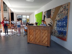 Auch musikalisch gab es einiges zu bestaunen – so unterhielt der Pop- und Jazzchor in den Pausen die Schulgemeinschaft mit Paul McCartneys „Ebony and Ivory“ und “Parkplatzregen” von Oliver Gies. Auch das Orchester des SMG leistete einen Beitrag mit jiddischen Liedern in der Aula. Wer sich weiter mit dem Thema „Anne Frank“, „Rassismus“ und „Diskriminierung“ auseinandersetzen wollte, konnte das mithilfe einer eigens dafür erstellten Auslage in der Bibliothek tun.